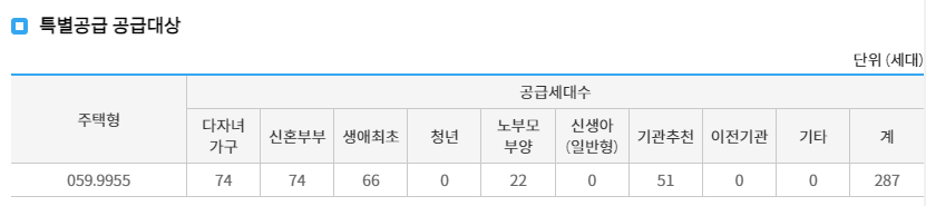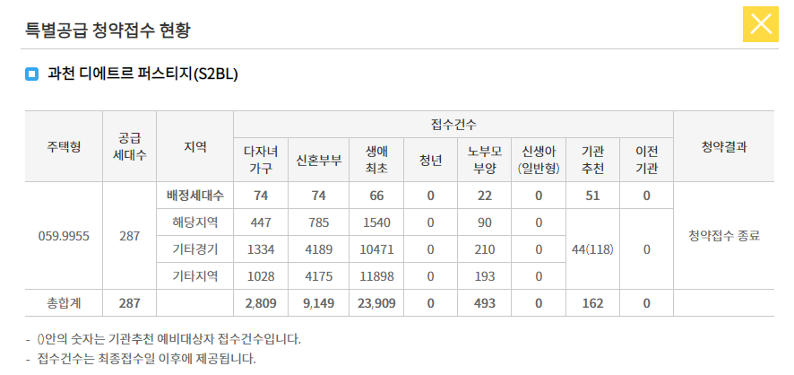 특별공급의 각 특공별 공급세대수 입니다. 요즘은 다자녀가구가 2자녀까지 떨어지면서 경쟁률이 더 높아졌죠?