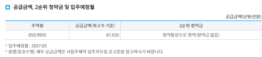 공급금액은 8억 7035만원이고, 입주예정월은 2027년 5월 입니다.