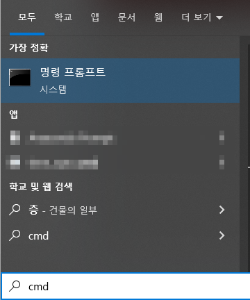 왼쪽 아래 윈도우 아이콘을 선택해주면 윈도우 메뉴가 뜨는데요. 이때 키보드로 cmd 라고 입력해주면 아래와 같이 명령 프롬프트가 선택되니 실행해 주세요.