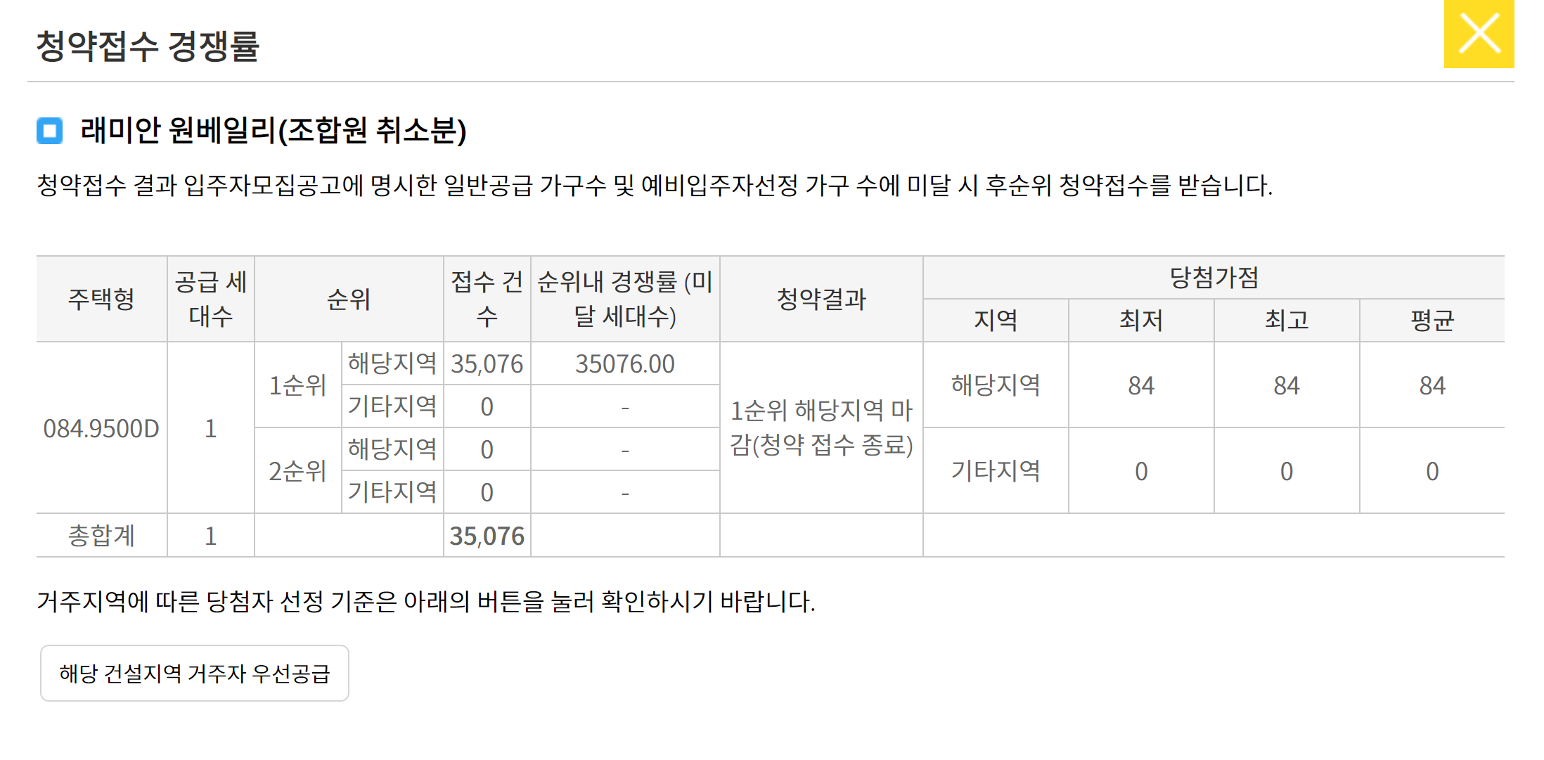 84점이라면 청약 통장의 만점인데요. 래미안 원베일리는 2021년 분양할 당시에도 만점 통장은 나왔다고 합니다.