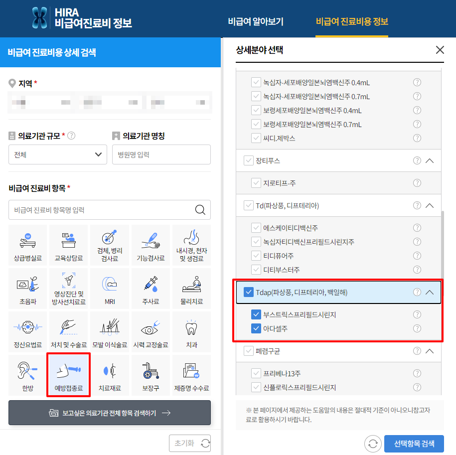 지역을 선택하시고 예방접종료 > Tdap을 선택해 주세요.