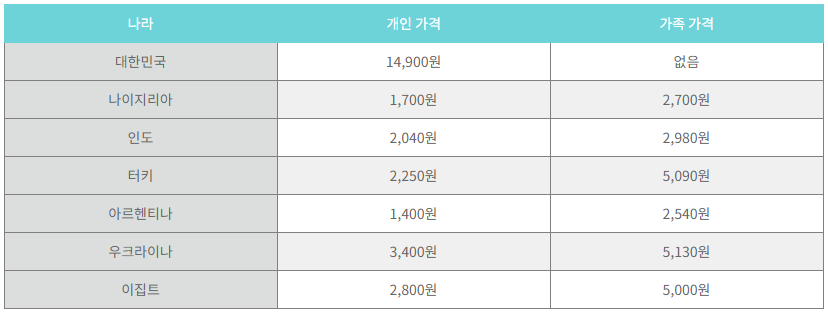 먼저 각 나라의 가격표를 알아보아야 합니다. 아래와 같이 우리나라보다 싼 가격대의 나라가 어디 있는지 알수 있는데요. 지금까지는 보통 아래의 나라들로 결제를 시도하였습니다.