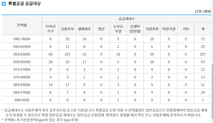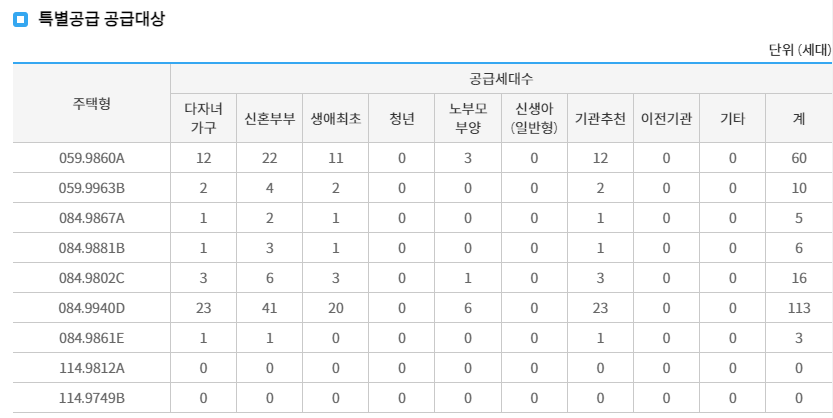 특별공급의 각 특공별 공급세대수 입니다. 요즘은 다자녀가구가 2자녀까지 떨어지면서 경쟁률이 더 높아졌죠?