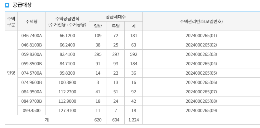 특공 604, 일반 620 합쳐서 총 1224세대로 공급규모가 꽤 큰편입니다.