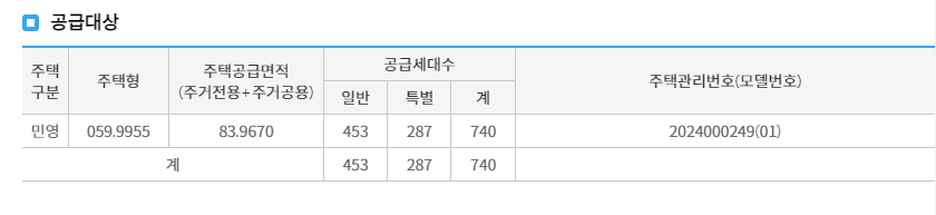 공급은 총 740세대로, 일반으로 453세대 분양이고, 특별공급으로는 287 세대 입니다.